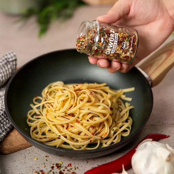 Avec de l'ail bio, du piment et des herbes sélectionnées, concoctez en un rien de temps un plat de pâtes aromatique digne de Bella Italia. Faites-les revenir dans de l'huile d'olive, ajoutez des spaghettis et votre gourmandise méditerranéenne est prête.