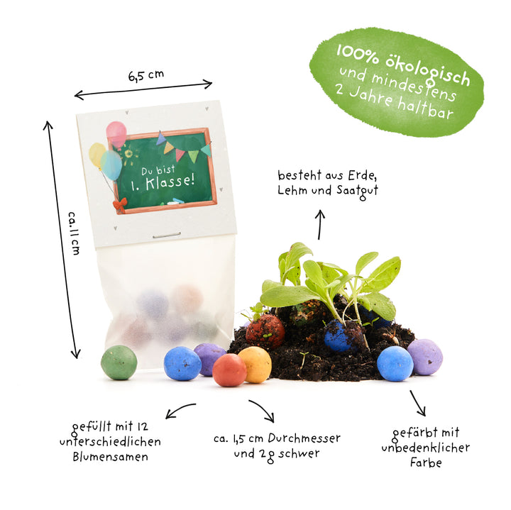 Une rentrée scolaire épanouissante :Ces billes fleuries colorées sont un accueil chaleureux pour la rentrée scolaire. Remplies de graines de fleurs sauvages indigènes, elles initient les enfants à la nature de manière ludique. Démoulez-les, arrosez-les et profitez-en ! Transformez le premier jour d'école en une petite aventure florale.