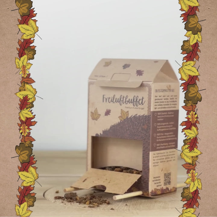 Ici, vous pourrez vous régaler à votre guise ! Richement garni des meilleurs ingrédients, le buffet en plein air est une halte appréciée des hérissons affamés : un endroit où se régaler et se ressourcer.
