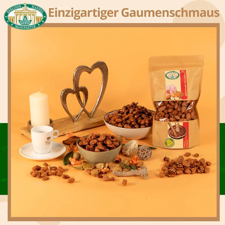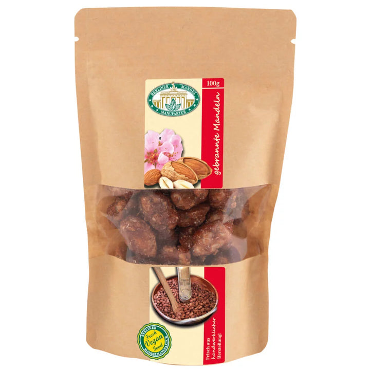 Ces gourmandises sucrées sont fabriquées à Berlin selon une recette familiale ancestrale. Seules des amandes Largueta espagnoles de première qualité sont utilisées pour ces amandes grillées populaires. Cette variété se caractérise par sa forme plate et son arôme particulièrement intense. Associées à du sucre et de l'eau, elles donnent des amandes grillées au goût de celles des marchés de Noël, en un rien meilleur. Entièrement sans arômes artificiels, colorants ni conservateurs, elles sont le fruit d'un savoir-faire artisanal et d'une généreuse dose d'amour.