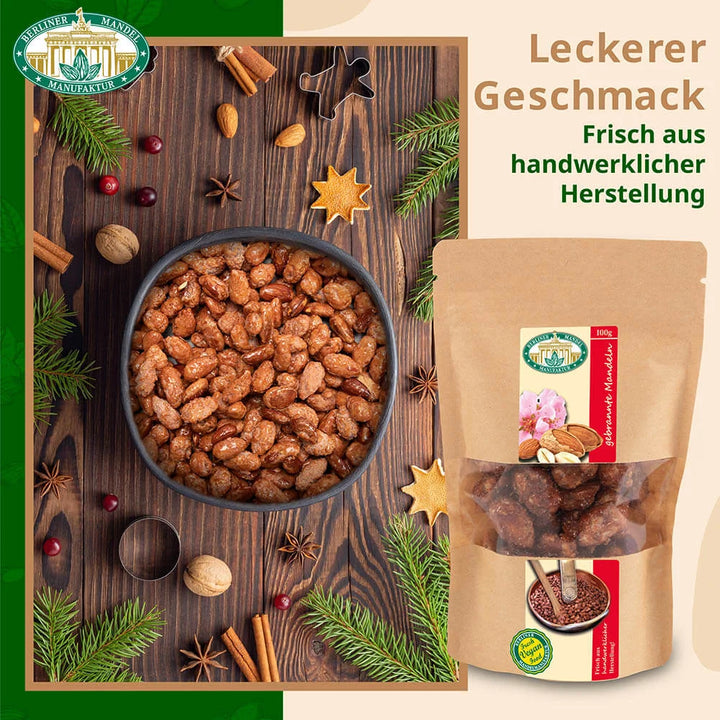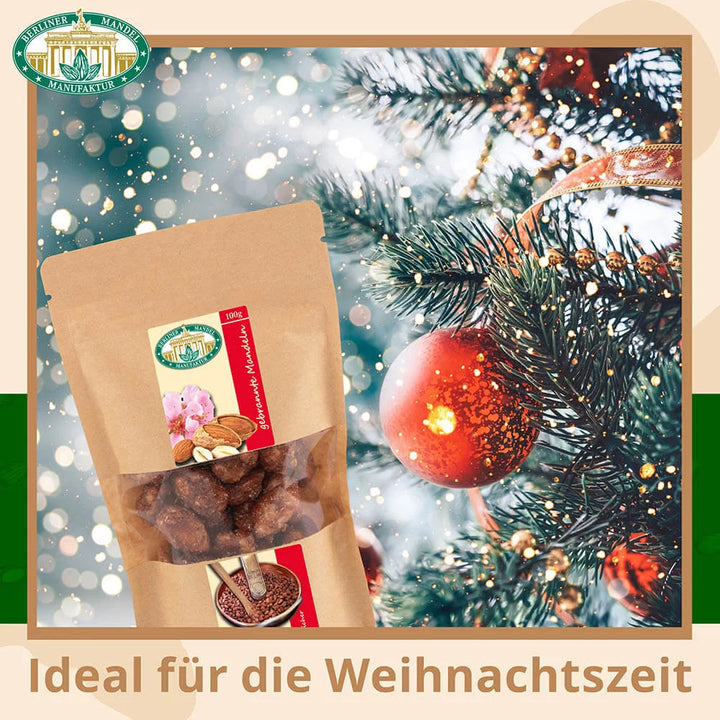 Voici le parfum de Noël : les amandes grillées de la fabrique d'amandes de Berlin vous apportent les saveurs du marché de Noël directement chez vous. Fraîchement grillées dans une chaudière en cuivre à Berlin, les amandes espagnoles Largueta déploient leur arôme particulièrement intense, créant une gourmandise croquante et sucrée pour la période de l'Avent.