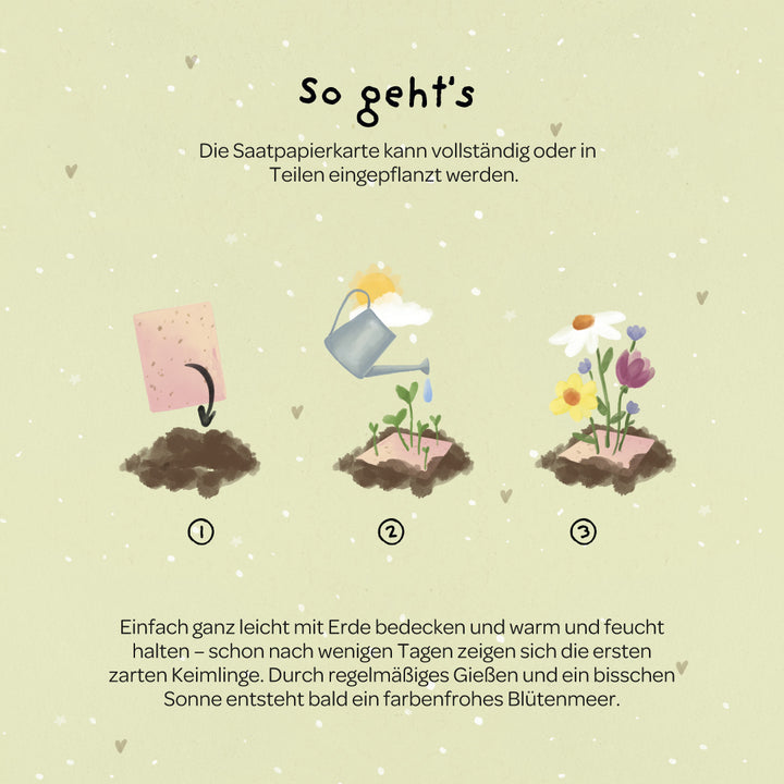 Il suffit de planterLa carte peut être plantée entière ou déchirée. Avec un peu de terre, d'eau et de soleil, une mer de fleurs colorées émerge – une petite lueur d'espoir qui grandit avec vous.