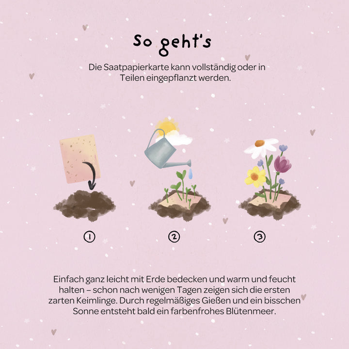 🌷 Plantez simplement :La carte peut être plantée entière ou déchirée. Avec un peu de terre, d'eau et de soleil, elle deviendra une mer de fleurs colorées, comme un rêve devenu réalité.