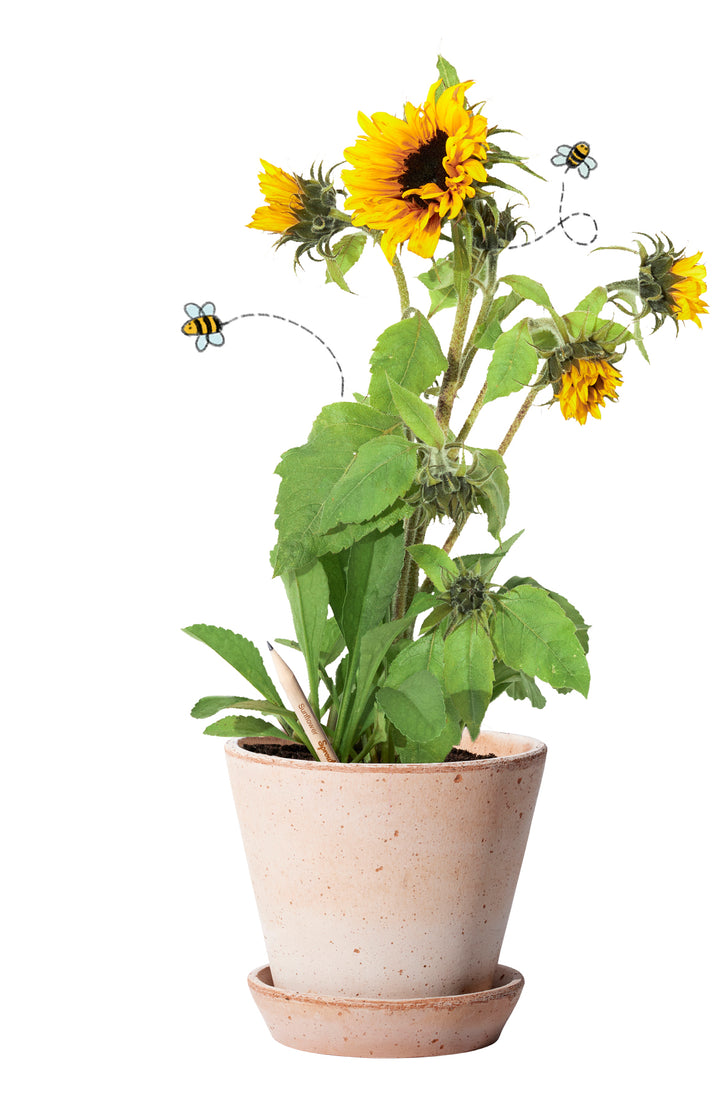 Le crayon à graines n'est pas un crayon ordinaire. Une fois utilisé, le bout ne finit pas à la poubelle, mais dans un pot de fleurs ! Plantez-le, donnez-lui du soleil, de l'eau et de l'amour, et regardez-le se transformer en un magnifique tournesol.