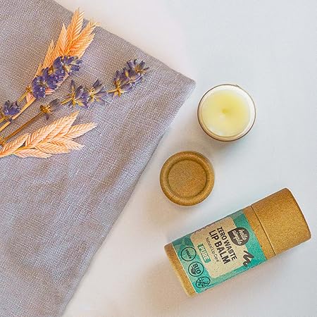 Baume à lèvres zéro déchet dans un emballage durable, avec le couvercle retiré à côté.