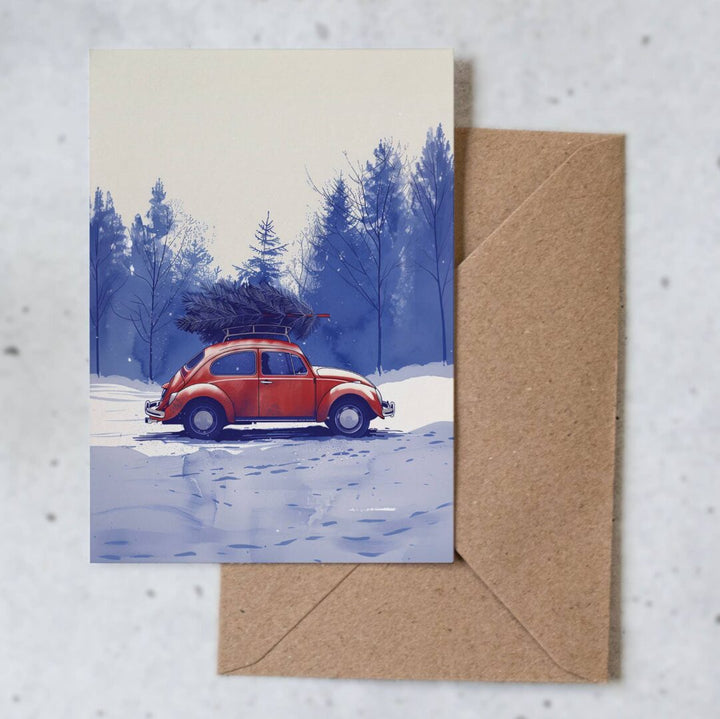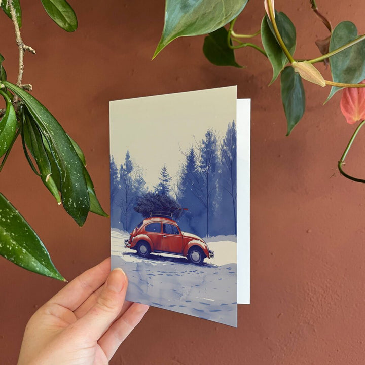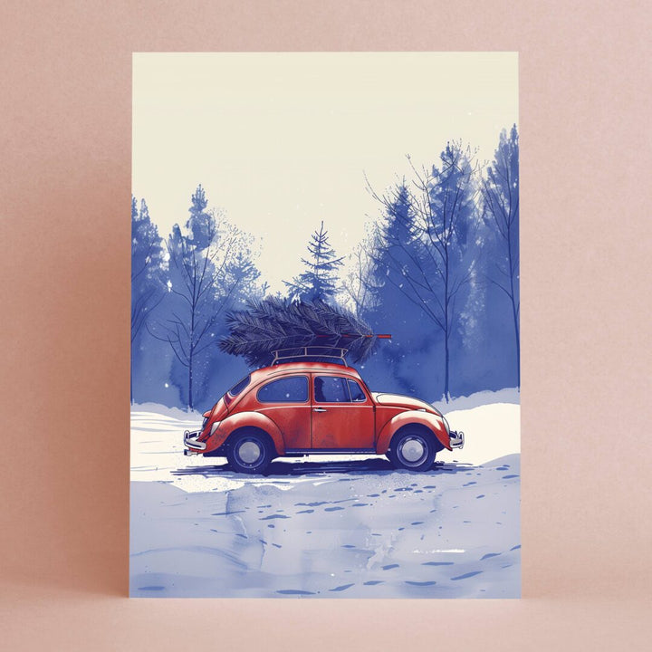 Cette charmante carte de Noël, intitulée « Acheter un arbre », présente une belle illustration d'une Citroën 2CV rouge classique transportant un grand arbre de Noël sur son toit et roulant dans la neige.célèbre l'esprit de Noëlavec une touche deCharme vintage.