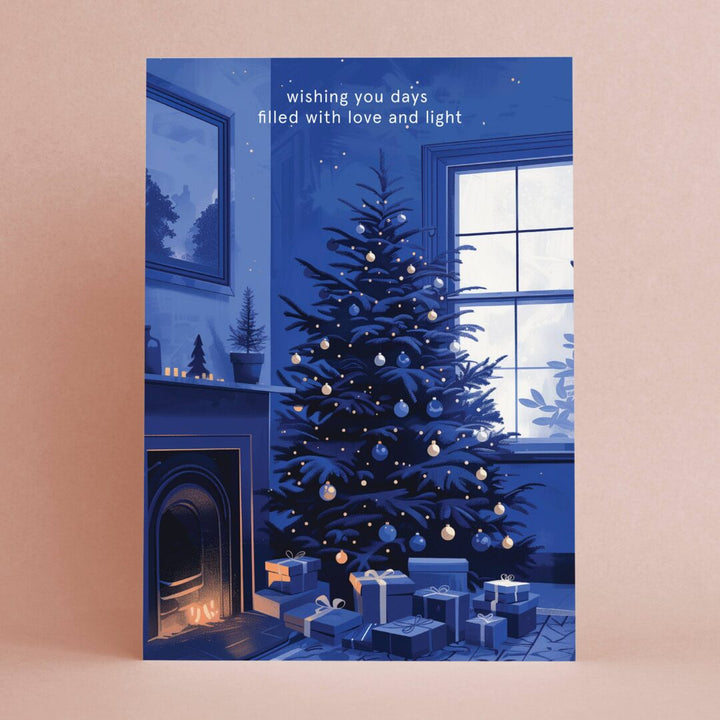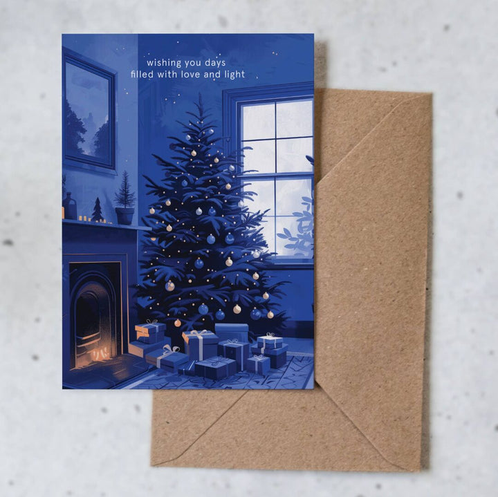 Ce carte de Noël réconfortanteavec le titre« À la maison pour les vacances »Cette illustration illustre magnifiquement un salon chaleureux et décoré pour Noël. On y découvre un feu de cheminée crépitant, un grand sapin de Noël décoré et une pile de cadeaux à ouvrir.