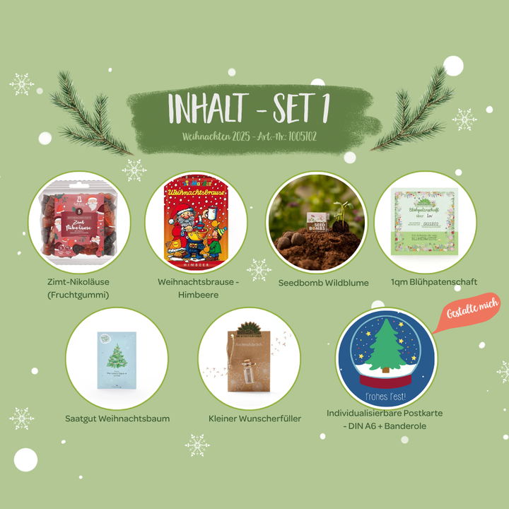 Im Preis inklusive sind eine individuelle Banderole für die Tischbombe und eine individuell gedruckte Postkarte. Zusätzlich zu den Produkten ist die Tischbombe mit Konfetti gefüllt :-)