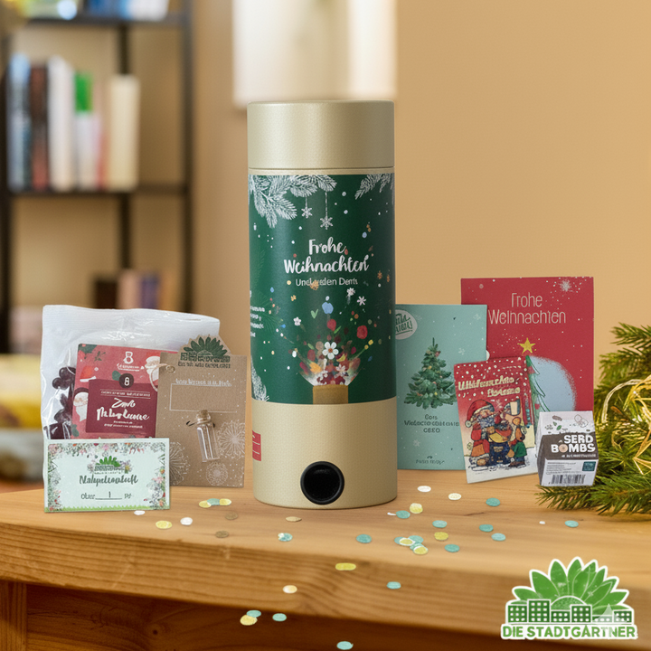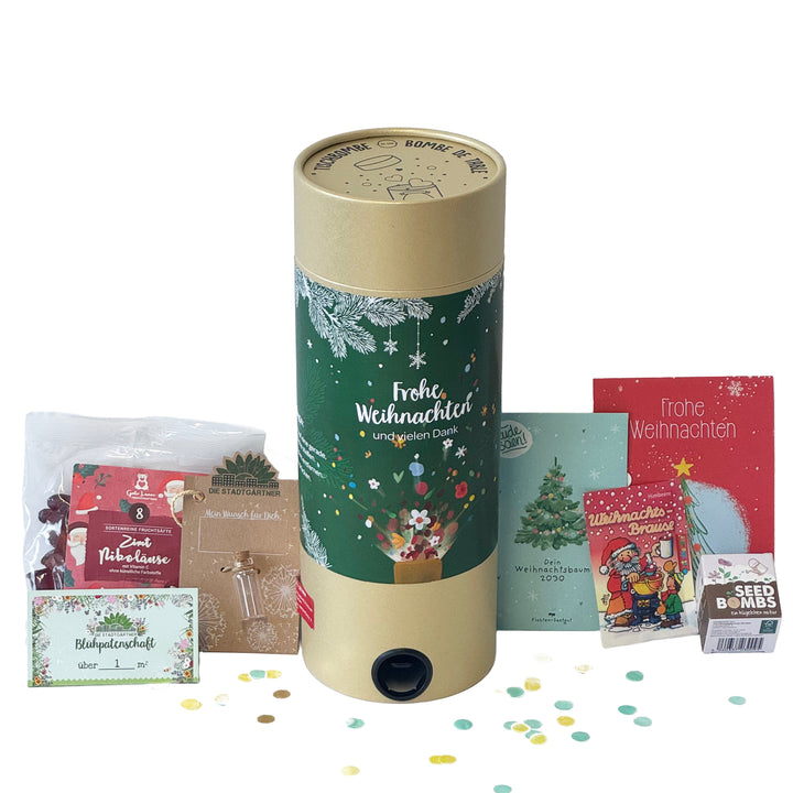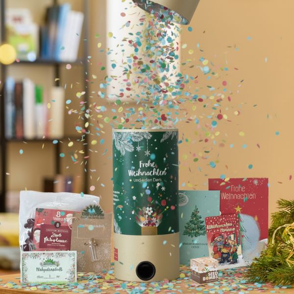 Weihnachten knallt's! Überrasche deine Kunden und Mitarbeitenden und lasse ihnen tolle Kleinigkeiten um die Ohren fliegen. Diese 11 x 30 cm große Tischbomben ist mit folgenden Geschenken gefüllt: