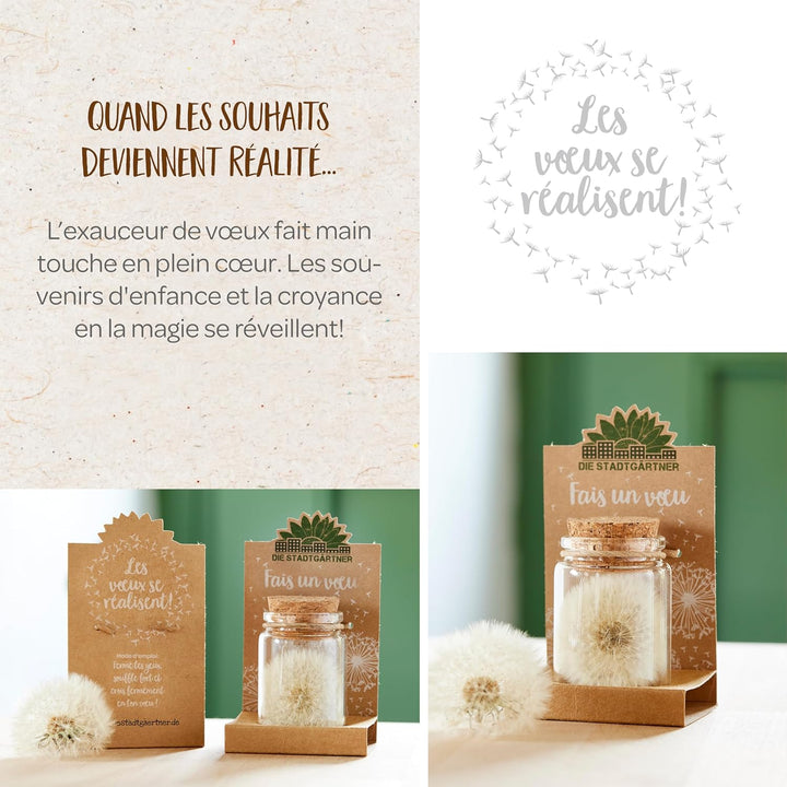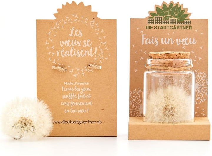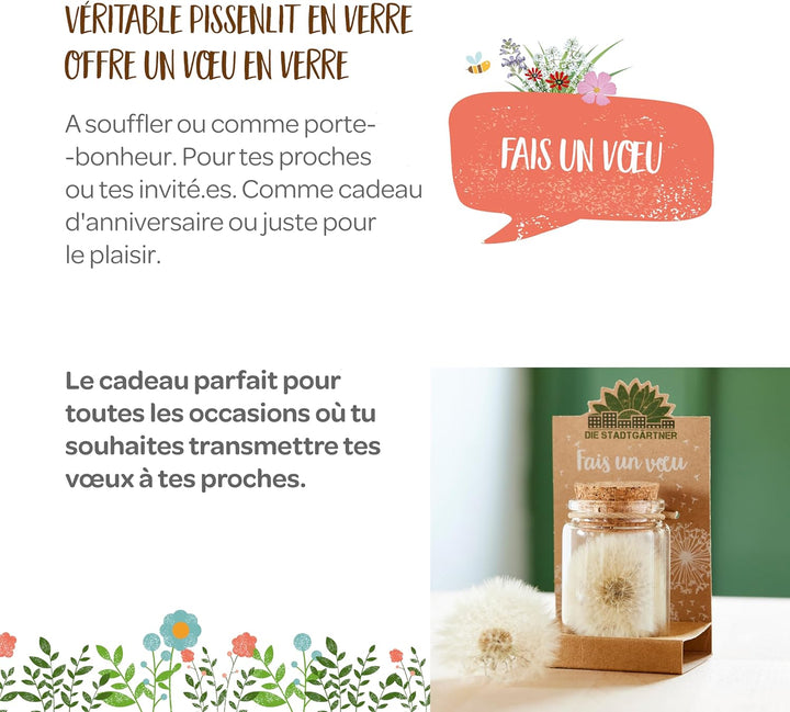 Le pissenlit exauceur de voeux: Chaque verre est rempli à la main et contient un pissenlit qui exauce plus de 100 vœux ! Sa durée est illimitée pour des vœux réalisables pour toujours !